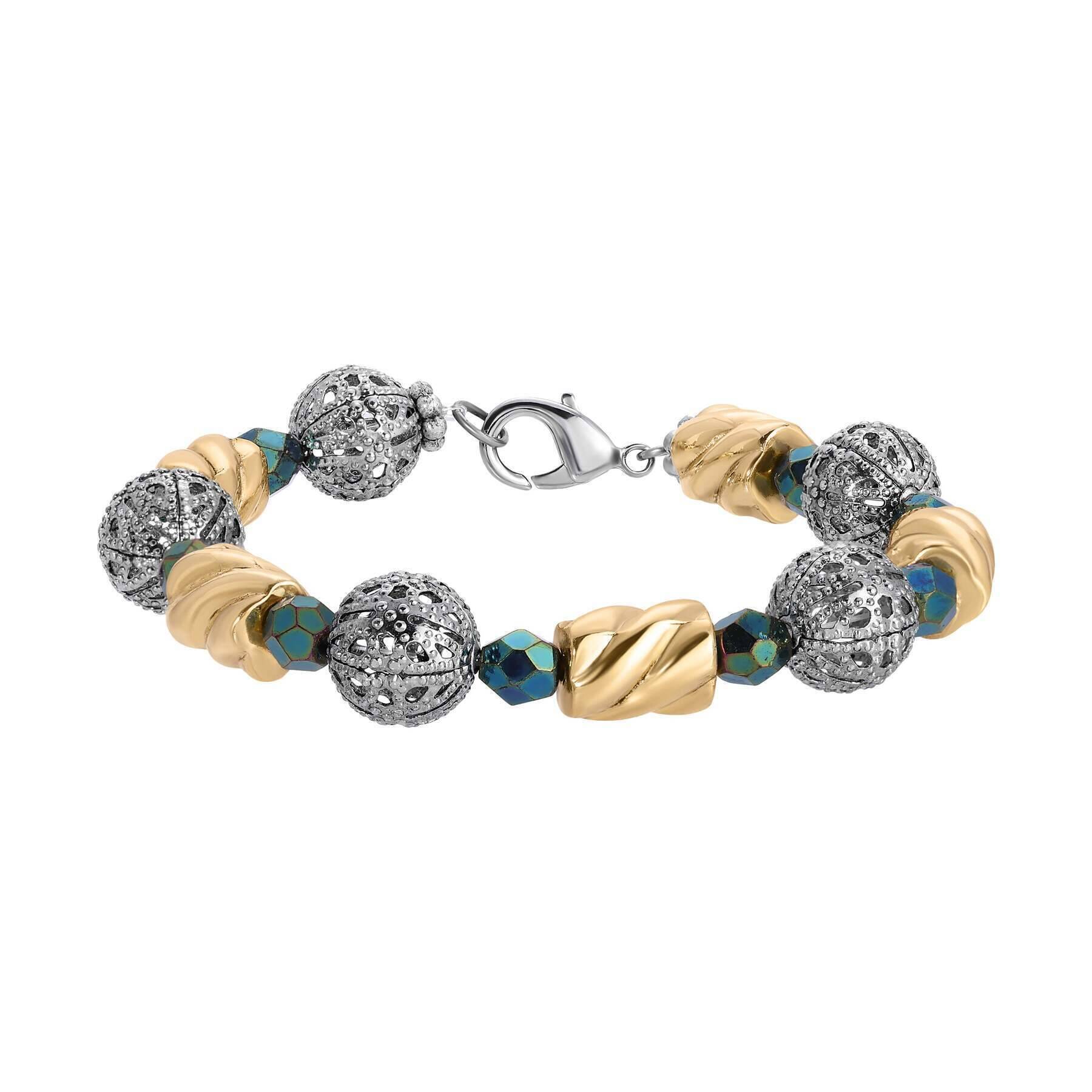 Stand out from the rest with this uniquely designed link bracelet! Featuring green fire polished Euro crystals, silver tone round filigree puff balls & twisted gold tone beads, This bracelet comes with flower beads at the ends & a lobster clasp for a secure fit.