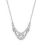 An woven pattern of delicate black tone metal chains create a scalloped bib while genuine Austrian Crystal elements dazzle throughout the bib necklace. A gorgeous piece with an interesting contrast that is perfect for special occasions. Beautifully combining refined romance, and minimalist edge it's ideal for any occasion.