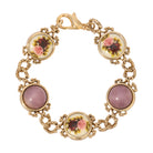This bracelet features alternating round purple amethyst quartz glass stones and delicately painted pink manor house stones framed in intricate gold-tone settings. The ornate links add vintage charm, connecting each centerpiece in a graceful circular pattern. With its soft hues and floral accents, it offers a romantic touch reminiscent of classic antique design.