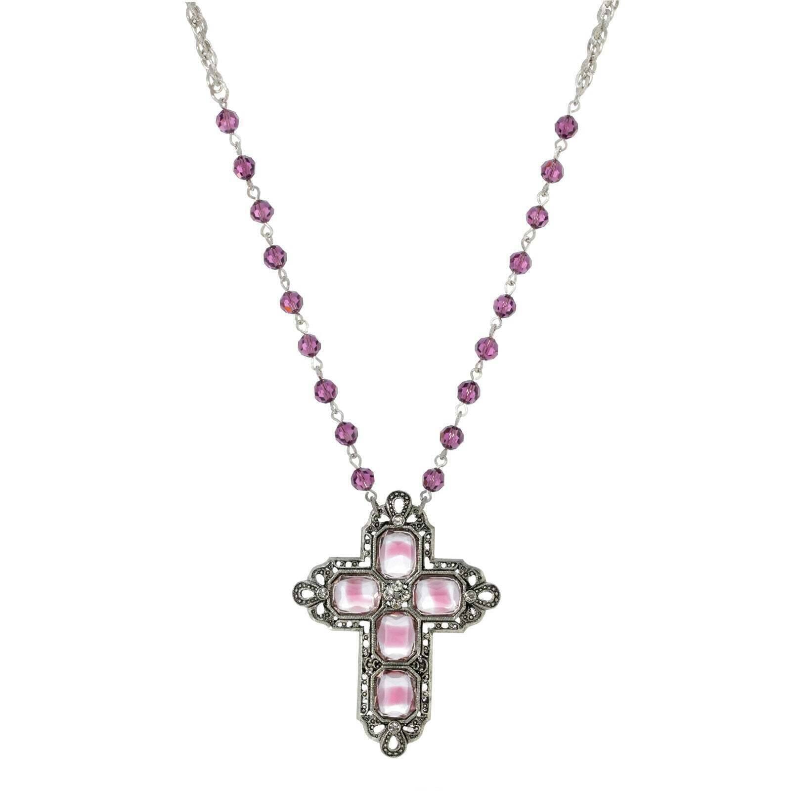 We've designed an elegant unique designed large cross drop necklace that goes perfect with daytime and evening attire. Featuring 5 octagon German glass stones on an antiqued filigree cross. The cross is then given 4 clear Czech crystal accents at the center. This magnificent work of art hangs elegantly on a silver tone chain with beads and given a 1928 logo with lobster clasp closure.