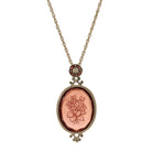 A softly tinted light amethyst glass features an elegant floral intaglio design, giving the pendant a refined vintage charm. Above it, a round amethyst enamel accent adds a touch of coordinated color and intricate detail. The piece hangs from a classic chain, creating a graceful statement that feels both artistic and romantic.