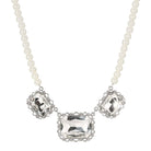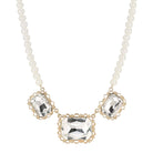 This stunning necklace showcases three dazzling octagon crystals elegantly arranged on a circular strand of lustrous white faux pearls. The sophisticated design is complemented by a 3-inch adjustable extension chain, ensuring a perfect fit for any neckline.