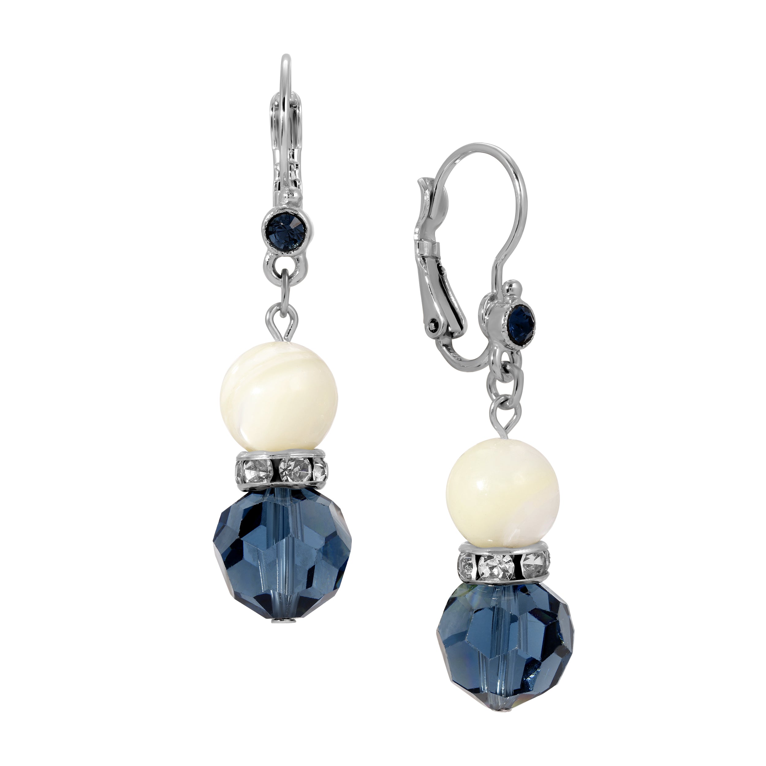 Graceful dangles pair creamy round mother-of-pearl beads with deep Montana Blue crystals for a rich, luminous contrast. Sparkling rhinestone accents and a petite navy crystal at the lever-back clasp add a touch of shimmer. A refined blend of color and texture brings a softly sophisticated look to any style.