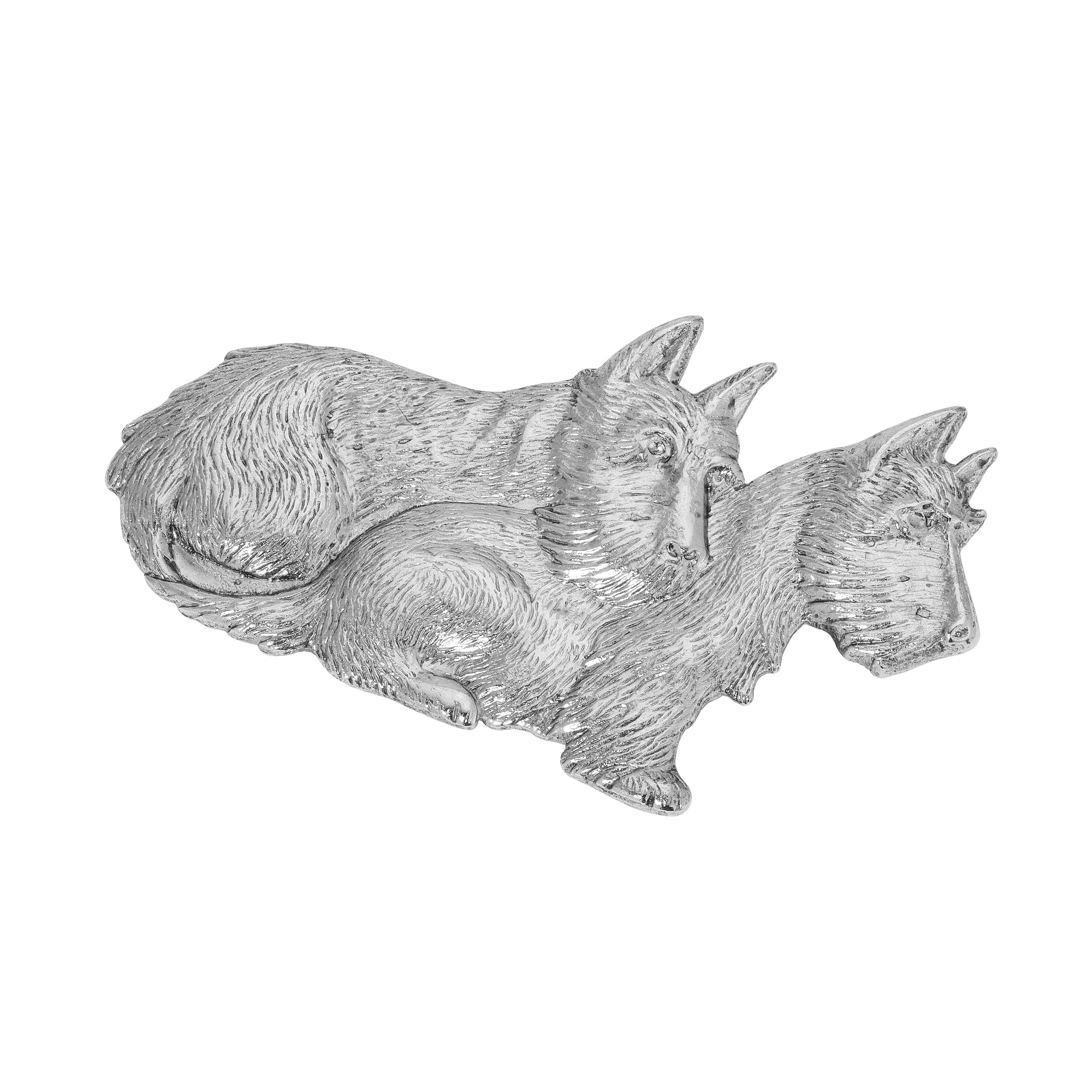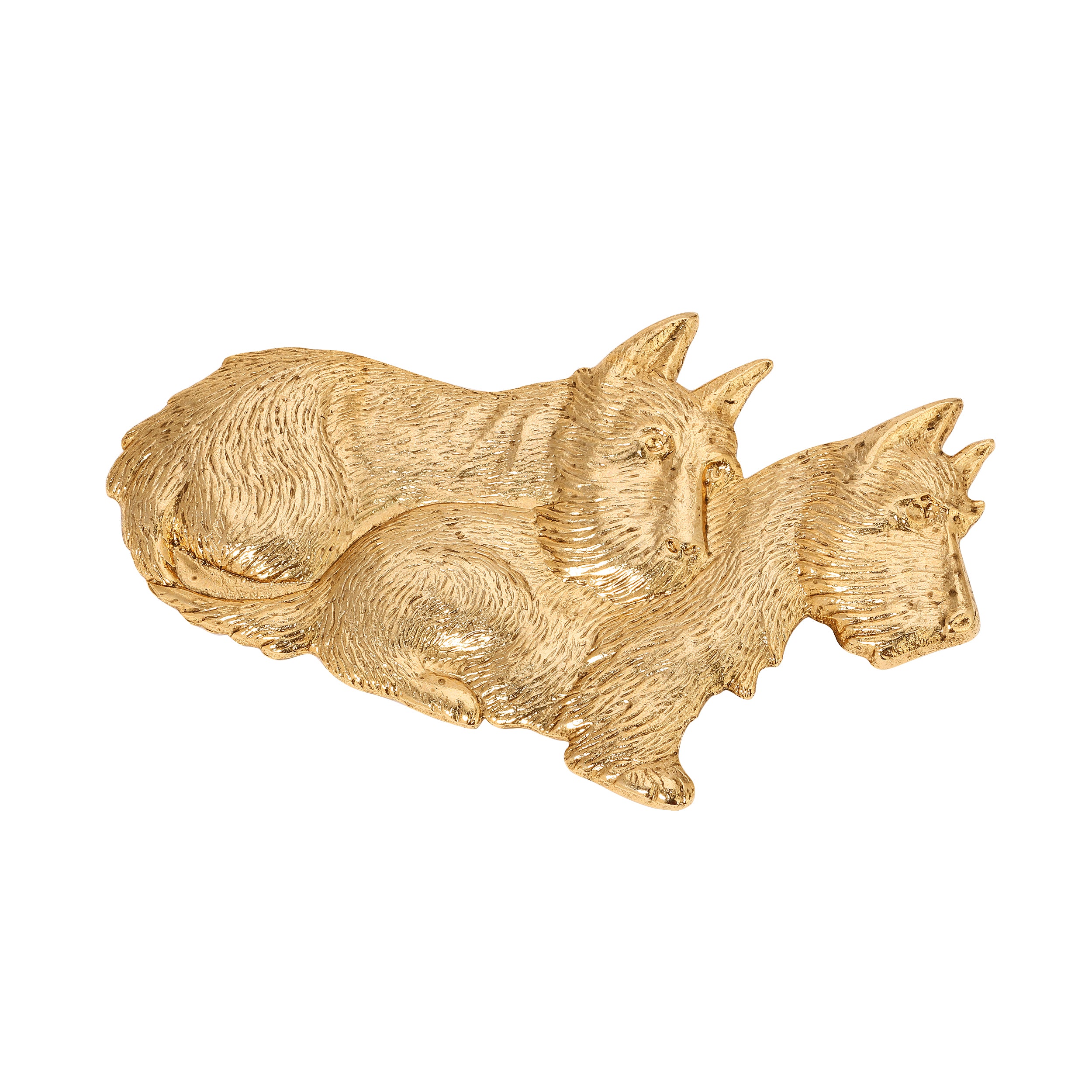 This brooch features two resting terrier dogs rendered in sculptural detail, their textured fur and gentle forms creating a sense of quiet companionship. The finish highlights the contours of each figure, giving the piece depth and subtle shine. A distinctive accent for jackets, scarves, or bags, it brings a touch of nature-inspired charm to any look.