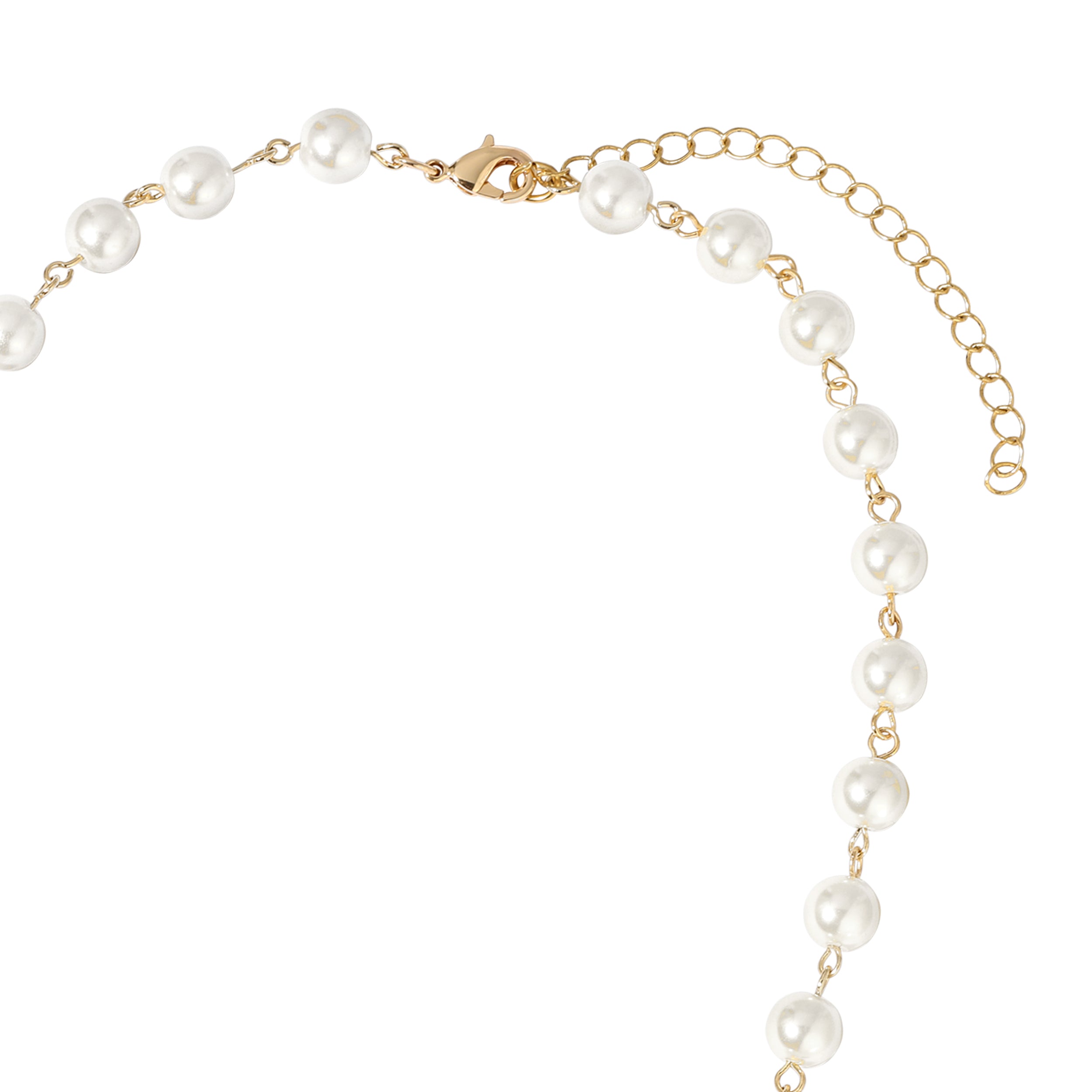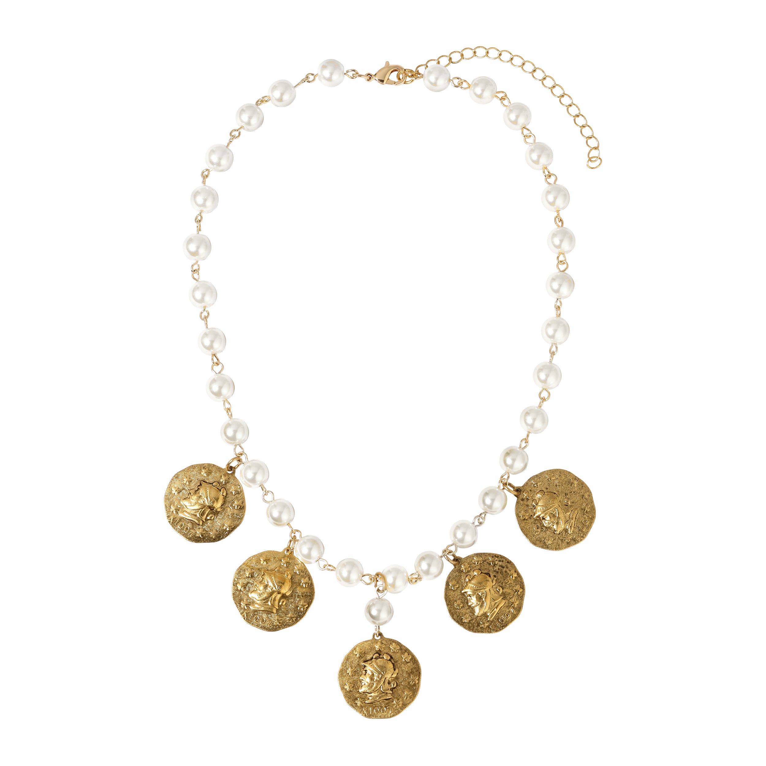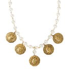 A delicate link chain is accented with luminous faux pearls and finished with round Vasco Núñez de Balboa coin charms that add historic character. The explorer Balboa is known for being the first European to discover the Pacific Ocean while crossing the Isthmus of Panama in 1513. The softly textured 14k gold dipped coins create gentle movement and a layered focal point along the neckline. Classic pearl styling paired with antiqued coin details gives this necklace a distinctive, heirloom-inspired look.