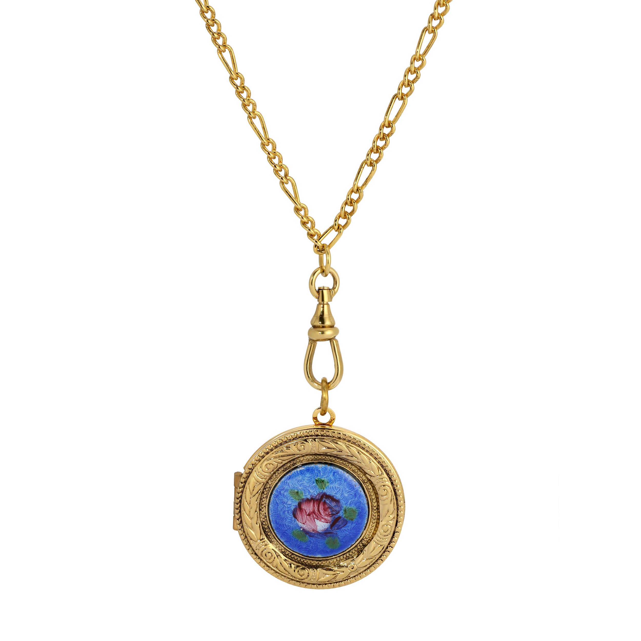 This 14k gold dipped locket necklace features an intricate circular pendant with ornate etchings and a vibrant enamel center showcasing a delicate pink rosebud motif. The pendant opens to reveal a polished inner compartment, perfect for holding a cherished photo or small keepsake. Paired with a classic chain and secure swivel clasp, it combines artistry and sentiment in an elegant vintage-inspired design.
