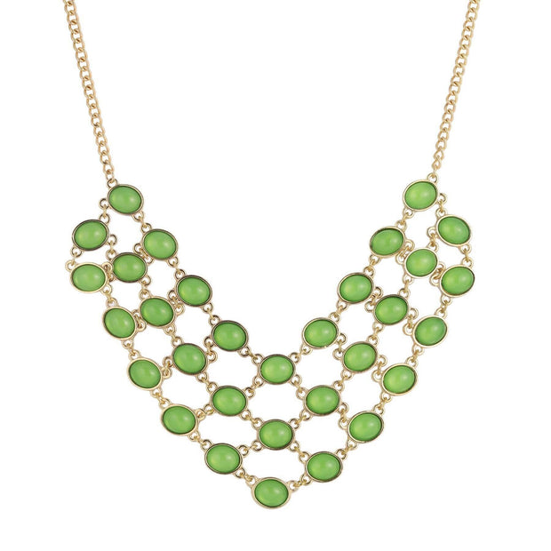 This bib necklace features green oval stones in gold-tone settings for a lovely pop of color. A fashionable piece that goes great with any outfit. This bib necklace is a sure head turner and a true elegant must-have. Its a perfect year-round accessory.