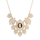 An intricate filigree design frames a classic black cameo centerpiece depicting a woman€š¬š¬š¬š¬€š¬š¬š¬ž¢s silhouette, evoking a sense of refined vintage artistry. Each ornate gold-toned panel is delicately linked, forming an elegant bib-style statement that captures light with subtle shimmer. The necklace beautifully bridges antique inspiration and modern grace, perfect for those drawn to heirloom charm.