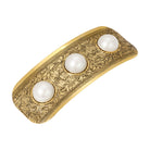 A refined 14k gold dipped hair barrette features intricate floral etchings that bring texture and elegance to its surface. Three luminous faux pearls pearl are symmetrically set along the center, creating a soft contrast against the rich metallic backdrop. The gently curved design adds sophistication and grace, making it a standout accessory for both classic and contemporary looks.