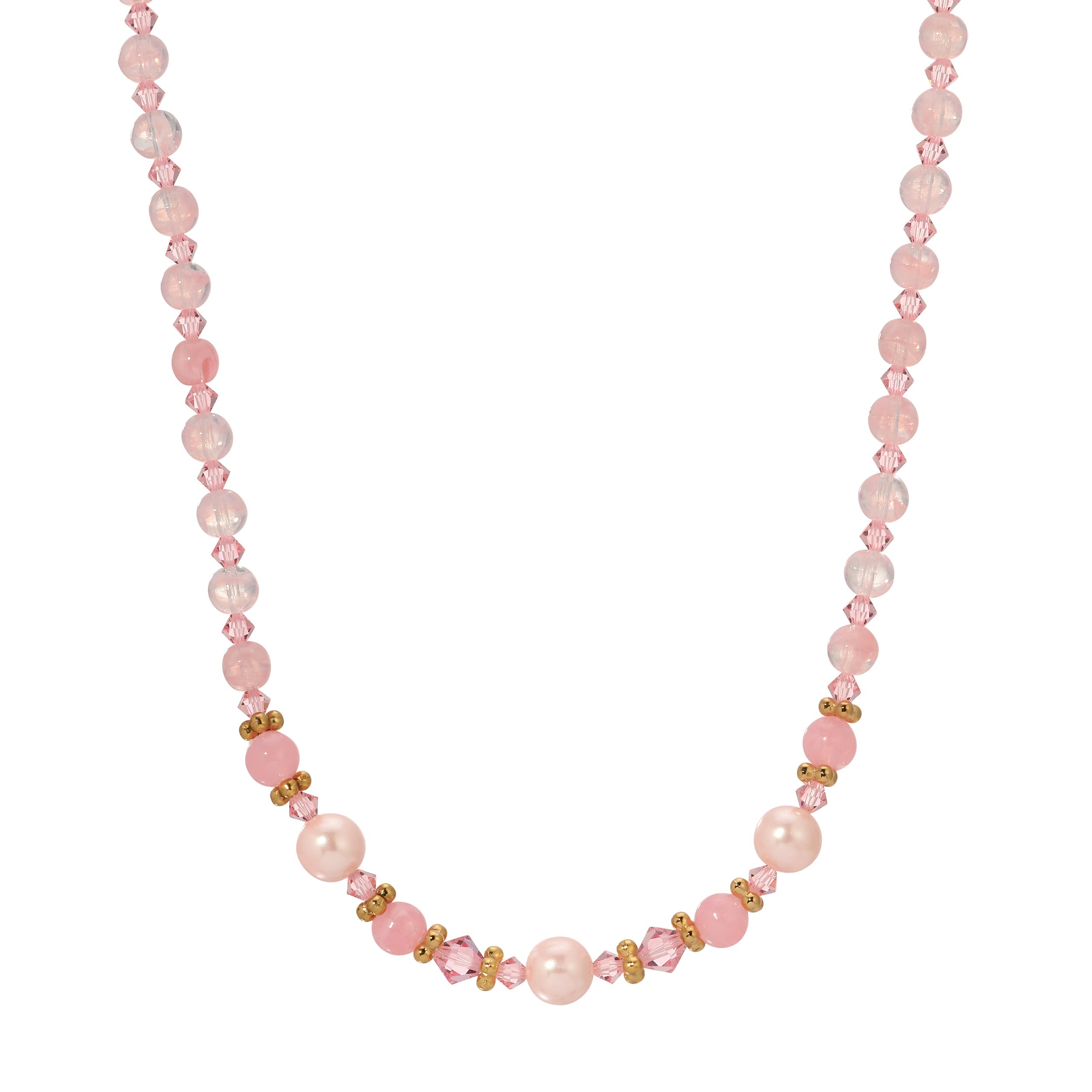 This delicate 15" necklace combines light rose crystal beads with soft pink faux pearls, creating a romantic and feminine look. Gold flower spacers add a touch of vintage-inspired charm and subtle elegance between each bead. Finished with a 3-inch extension chain, it offers adjustable length for a perfect fit with any neckline.
