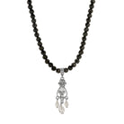 A strand of glossy black faceted beads leads to an ornate silver-tone pendant that exudes vintage charm. The centerpiece features an intricate filigree design adorned with sparkling crystals and three dangling teardrop-shaped accents. Perfect for adding drama to evening attire, this necklace combines dark elegance with delicate detail.