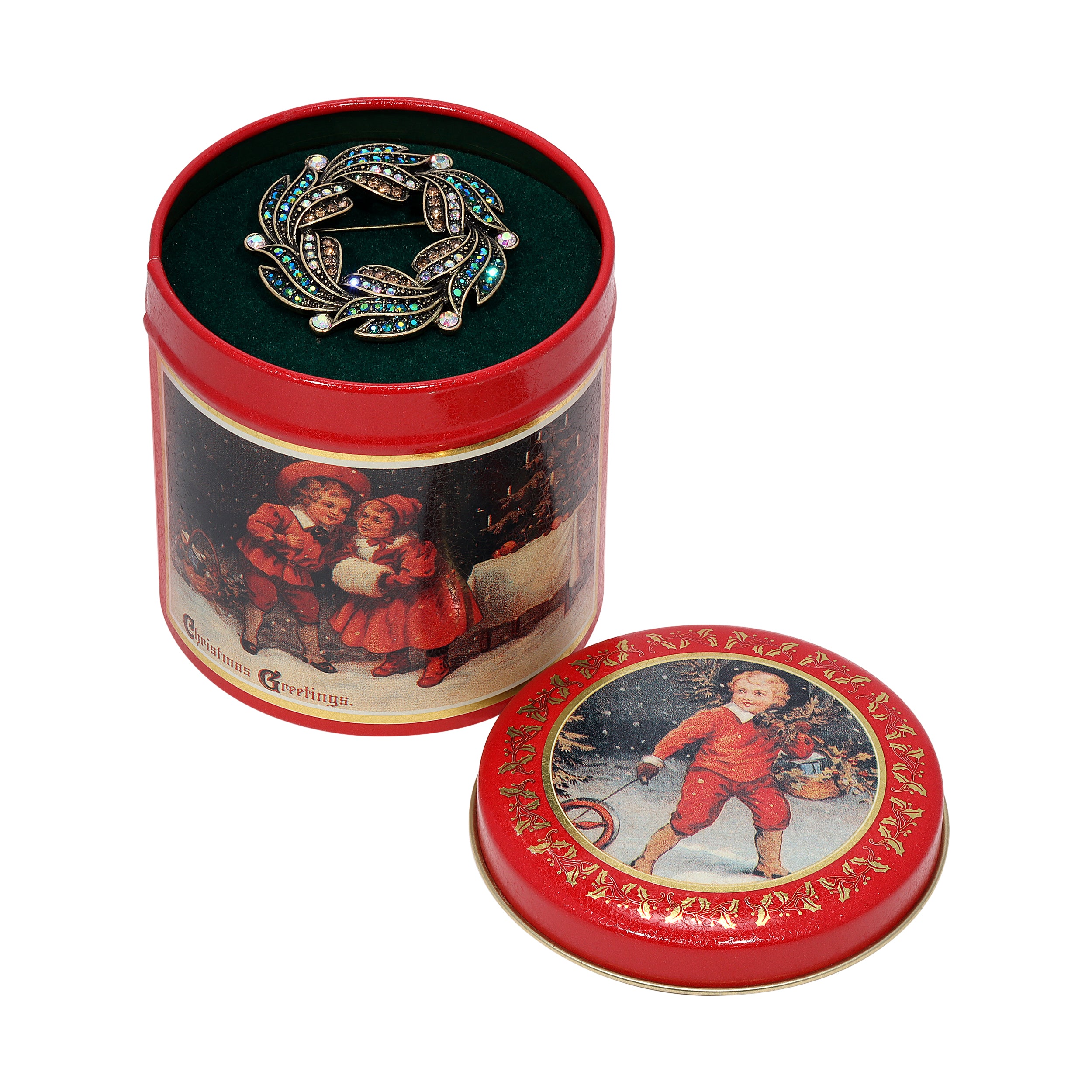 Presented in a festive holiday tin, this mesmerizing iridescent brooch dazzles with vintage charm. The antiqued gold-tone wreath design is elegantly adorned with a radiant mix of round aurora borealis, warm topaz, and sparkling clear AB glass stones‚¬š¬š¬š¬š¬€š¬š¬š¬š¬�each catching the light with enchanting brilliance. A timeless accessory perfect for the season.