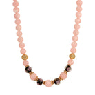 This necklace features soft pink rose quartz beads paired with faceted black glass beads adorned with delicate rose motifs. Accented with 14k gold-dipped details, it combines elegance with a touch of warmth. A refined piece, it adds a graceful, floral-inspired charm to any ensemble.