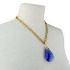 A teardrop-shaped sapphire glass crystal shimmers with deep ocean-blue brilliance, suspended from a gleaming 14k gold-dipped chain. The faceted briolette cut captures and reflects light beautifully, creating a captivating sparkle with every movement. Finished with a delicately detailed gold cap and sturdy link chain, this piece radiates elegance and sophistication.