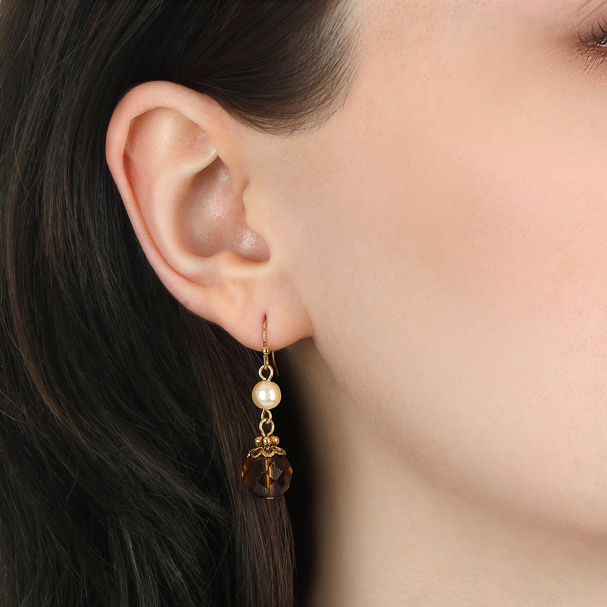 These earrings showcase a graceful blend of warm amber-toned crystals and lustrous faux pearls, perfectly suited for the fall season. The Smoked Topaz Brown Faceted Fire Polished Glass Beads capture and reflect light with a soft golden shimmer, evoking the rich hues of autumn leaves. Paired with 6mm peach-colored faux pearls, they offer a delicate contrast of texture and tone. Finished with fine gold accents, this design brings a touch of seasonal charm and refined elegance to any outfit.