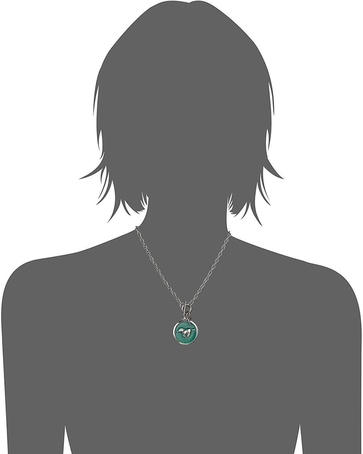 This amazing horse pendant features a turquoise color background with a 3 dimensional horse in silver tone with smooth edges and 18" toggle chain.