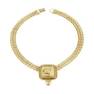 Make a statement with this striking gold-toned costume necklace. The gold links form a double chevron pattern and cascade down to a beautiful medallion that features a Grecian woman resting on a chair. The medallion is accented by a polished faux pearl.