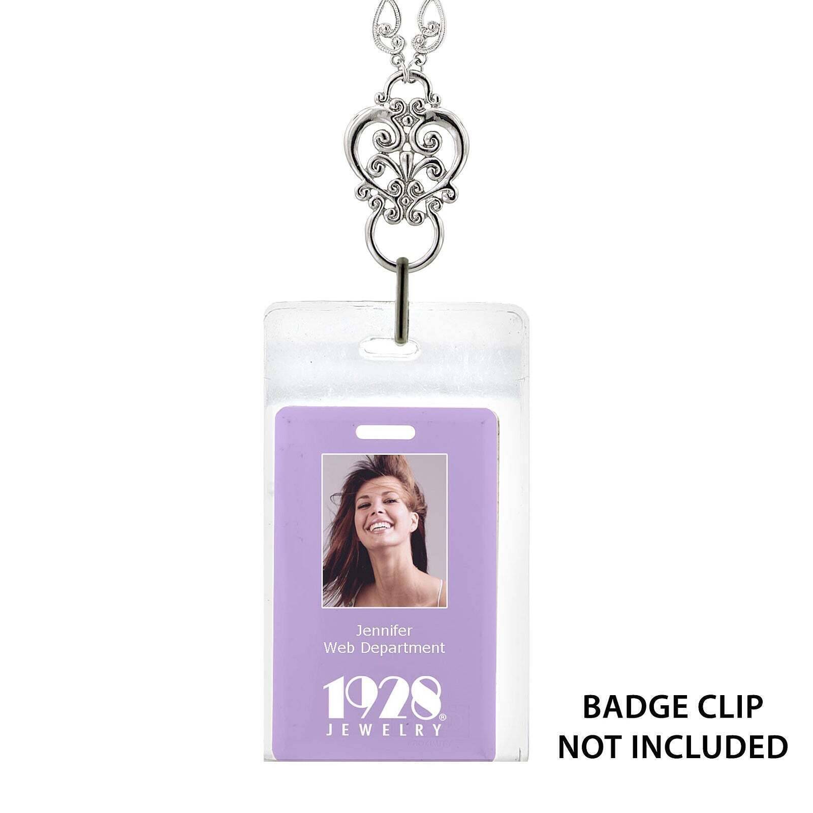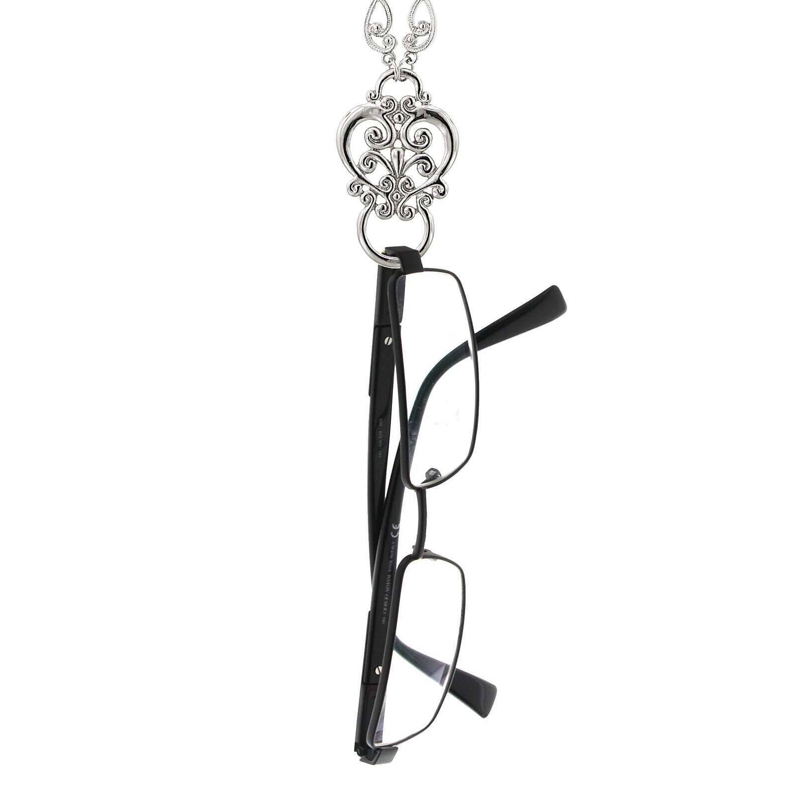 28" long necklace features a detailed filigree heart pendant, specially designed to securely hold eyeglasses, sunglasses and work ID / badges.