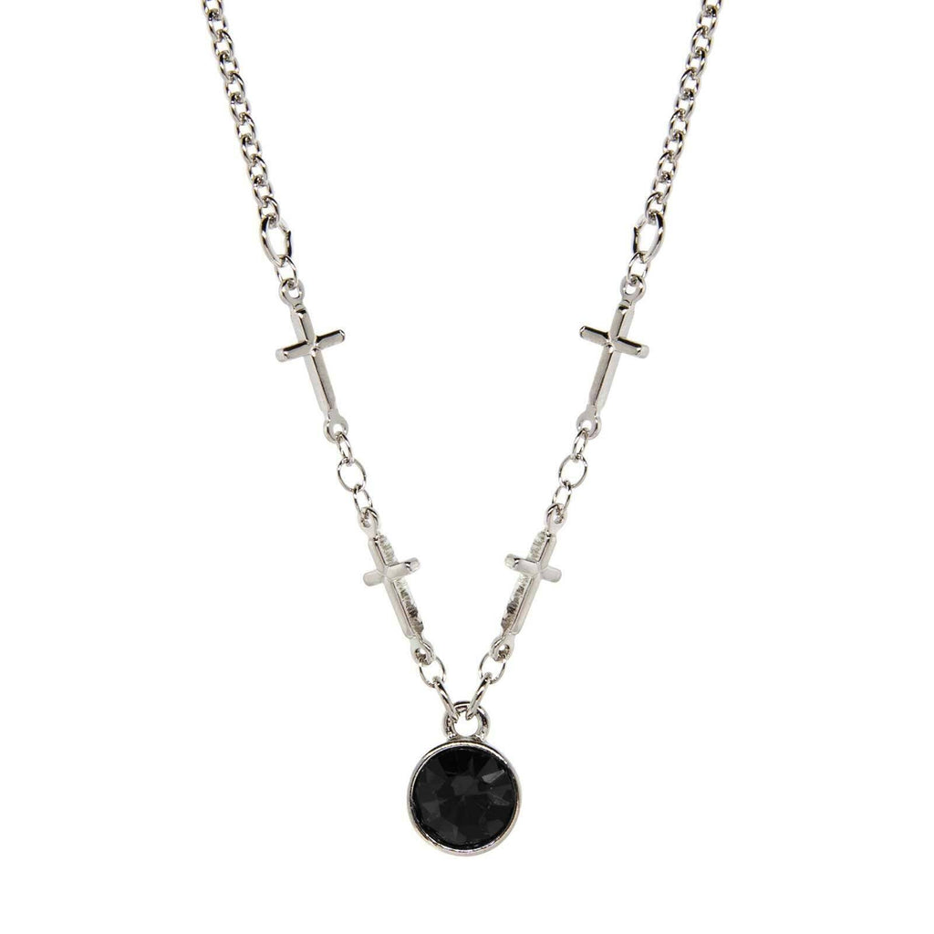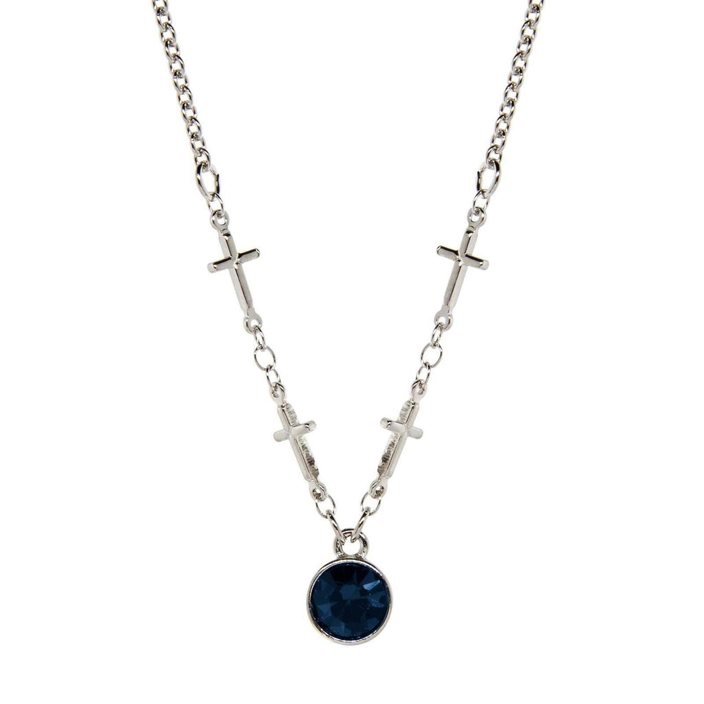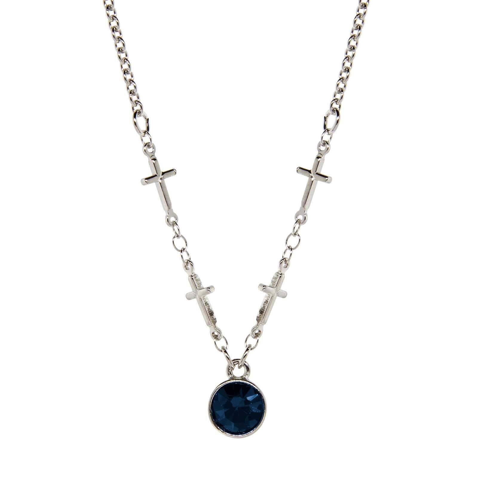 This fashionable and eye-catching crystal pendant necklace features a sleek silver-tone cable chain accented with cross-shaped stations. Presented on a Symbols of Faith themed card. This antiqued cross chain is a fine example of vintage style symbols of faith collection. Available in Blue, Purple And Black.