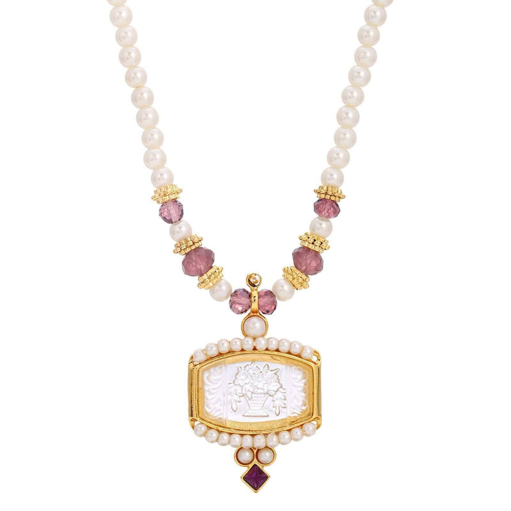 1928 Jewelry Faux Pearl Strand Etched Flower Bouquet Glass Intaglio Purple Crystal Pendant Necklace 15" + 3" Extender