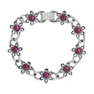 Rich channel crystals sit in ornate frames, each link connected by textured chains for a beautifully detailed look. The repeating design creates a rhythmic flow of color and shine around the wrist. Finished with an embossed clasp, the bracelet offers a vintage-inspired touch with striking jewel accents.