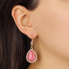 A pair of gold 14k gold dipped teardrop earrings featuring luminous moonstones framed by sparkling clear crystals. The gentle shimmer of the stones catches the light beautifully, creating a soft and graceful radiance. Finished with opal-accented lever-back closures, this design blends vintage charm with refined sophistication.