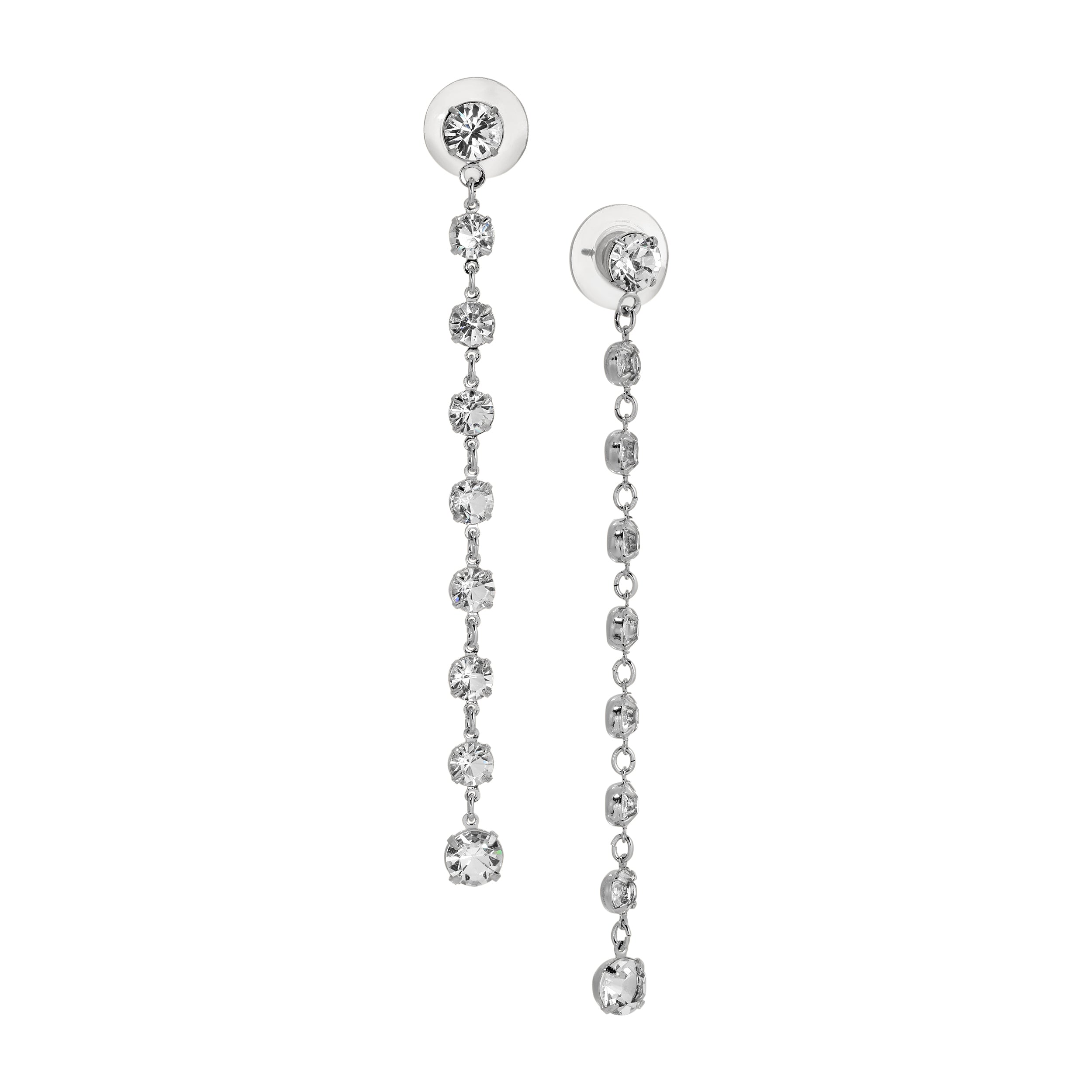 Delicate Austrian crystals shimmer along a slender silver-tone chain, creating a graceful cascade of light. Each stone is precisely set to capture brilliance with every movement, adding subtle sparkle and charm. The linear drop design brings a refined, modern touch to both casual and formal looks.
