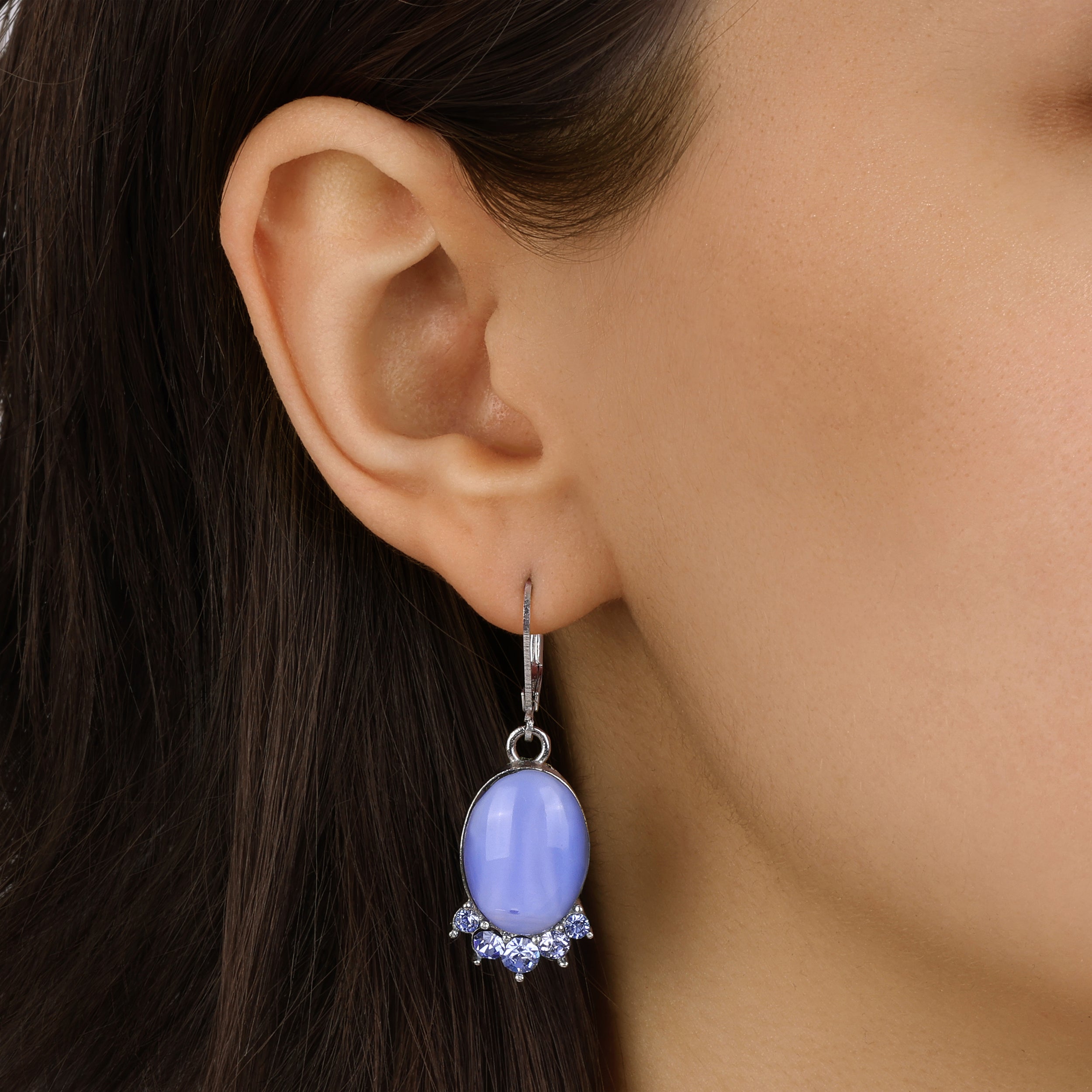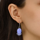 These elegant earrings feature smooth oval blue moonstones that radiate a soft, luminous glow. Accented with sparkling light sapphire crystals at the base, they add a touch of refined sparkle to any look. Perfect for both daytime elegance and evening sophistication, these earrings capture timeless beauty with a modern twist.