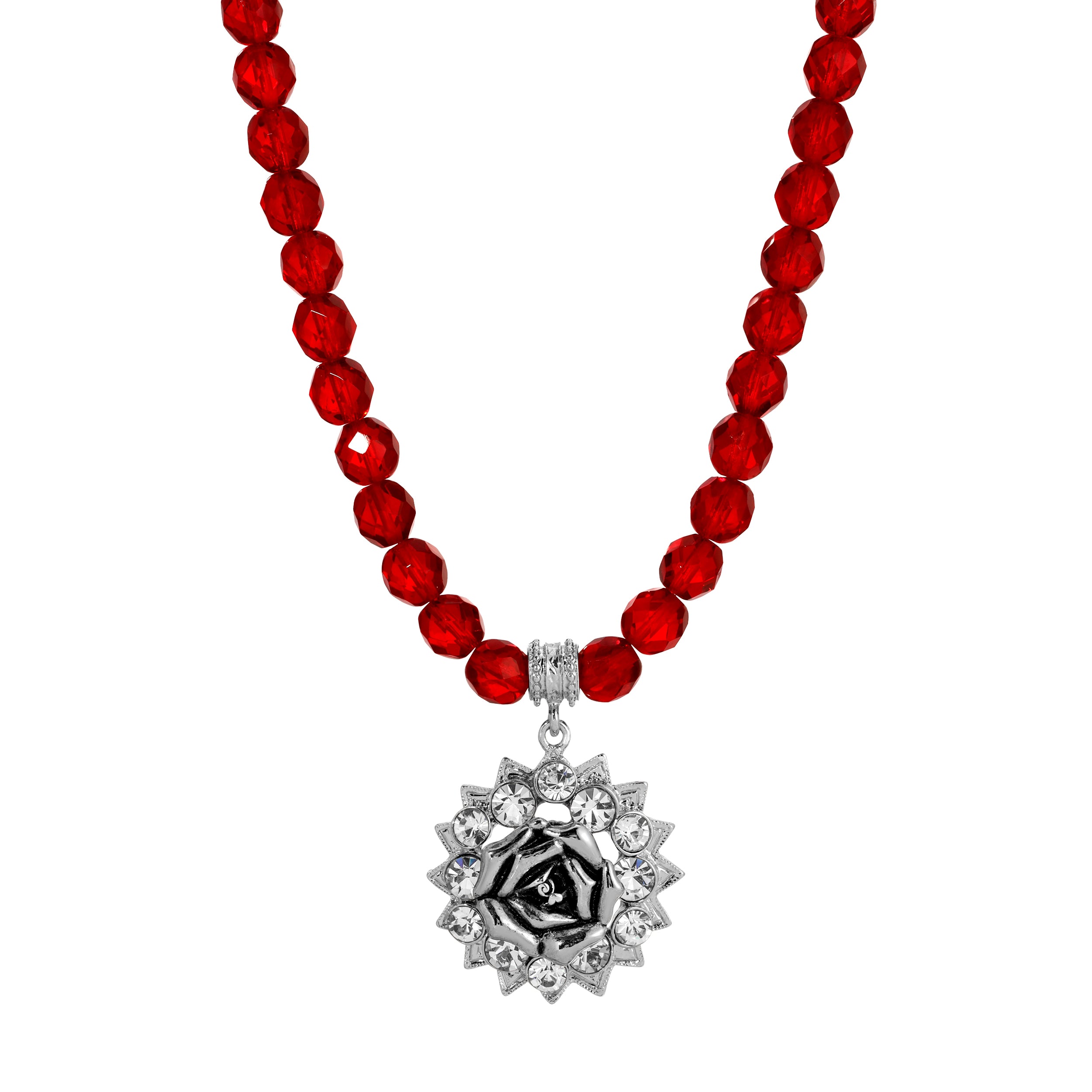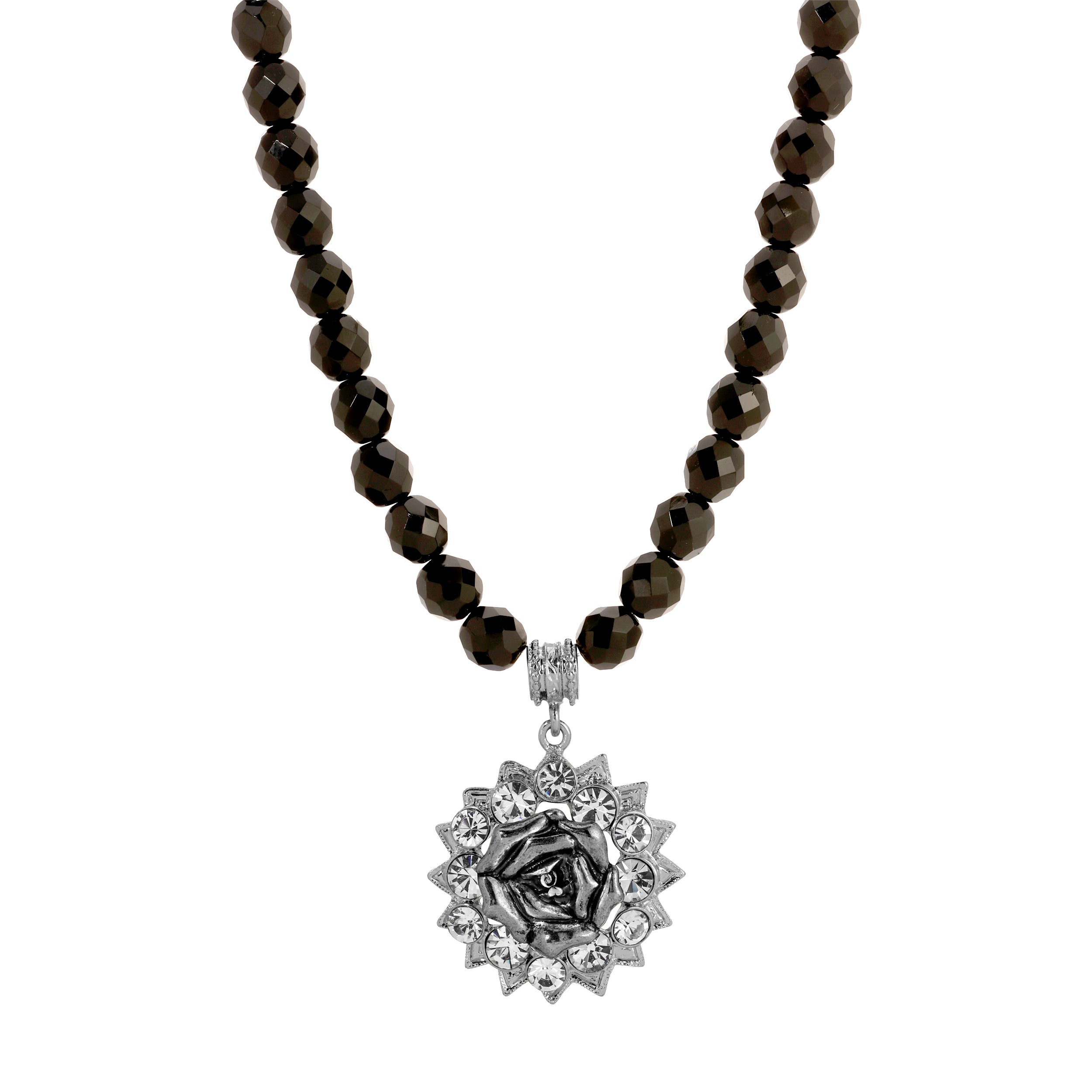1928 Jewelry Romana Octagon Etched Glass & Crystal Pendant Necklace 18"