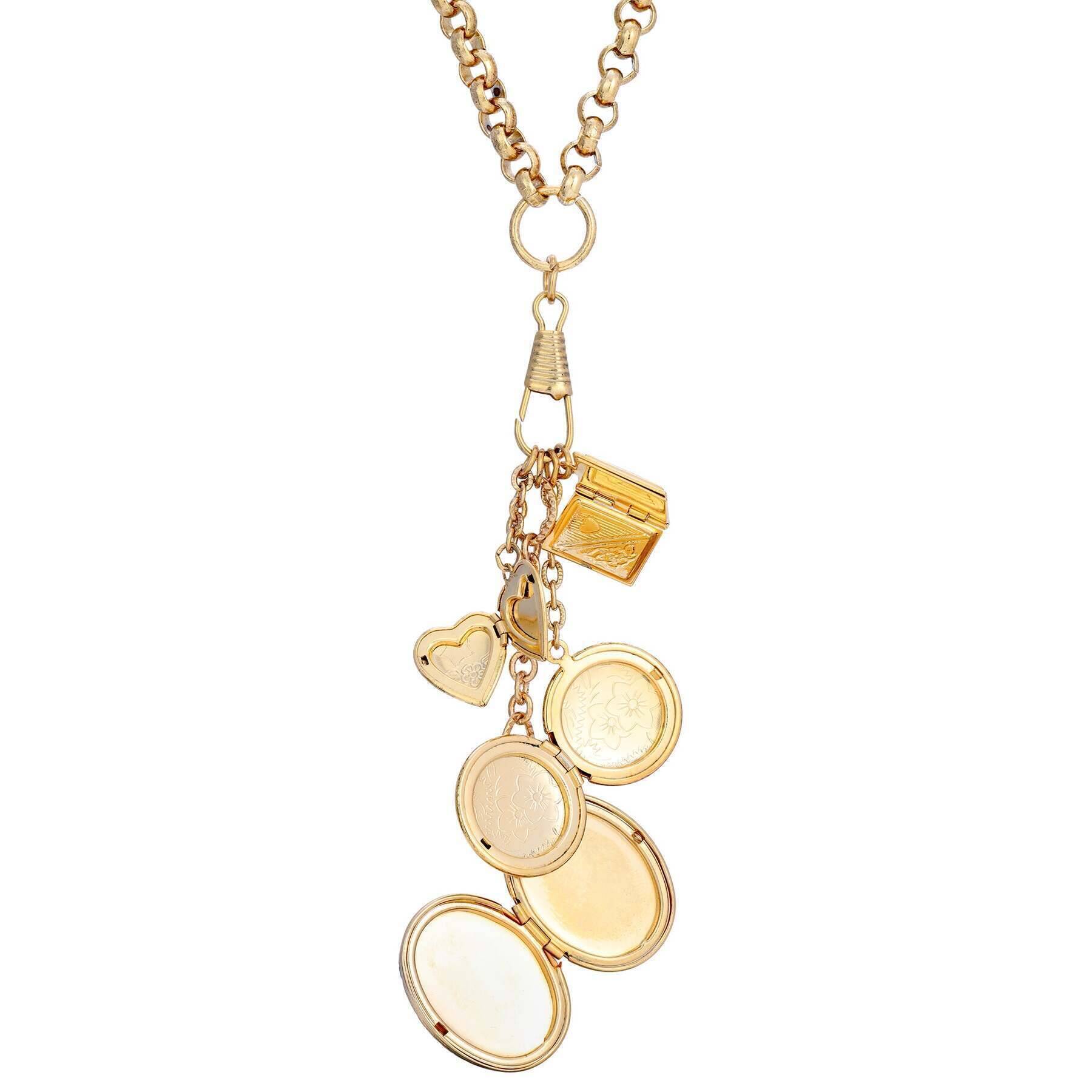 Beautifully designed. This classic locket necklace is a must have! Dangling off a 28 inch 14K gold dipped chain with detailed locket featuring a classic Victorian art piece which opens up to a lovely locket to display a precious photo near and dear. Accented with more three fun lockets!