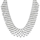 An intricate web of Austrian crystals forms a wide, flared silhouette that rests beautifully along the collar, creating an eye-catching statement. Each faceted stone is linked in a delicate lattice pattern, allowing the necklace to shimmer with fluid, multidimensional sparkle. The silver-tone setting adds a refined vintage character, making it a striking choice for evening wear or formal occasions.