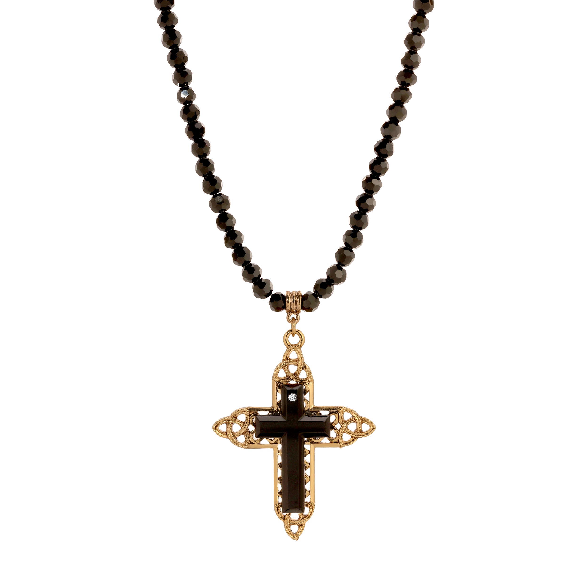 A black glass beaded strand is accented with shimmering black Euro crystals, leading to an ornate cross pendant that blends dark elegance with warm gold-tone detail. The faceted beads catch the light subtly, creating depth and contrast against the smooth, glossy cross center. Striking yet refined, this necklace brings a dramatic finish to both everyday looks and evening wear.