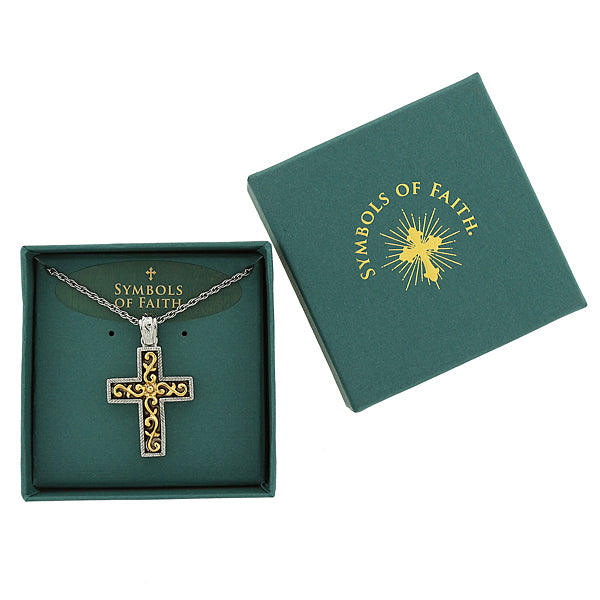 A thin rope chain holds together an antique finished silver-tone and 14K gold-dipped cross. The center is embedded with 14K gold-dipped vine patterns with floral detailing on the back and sides making it a reversible necklace.