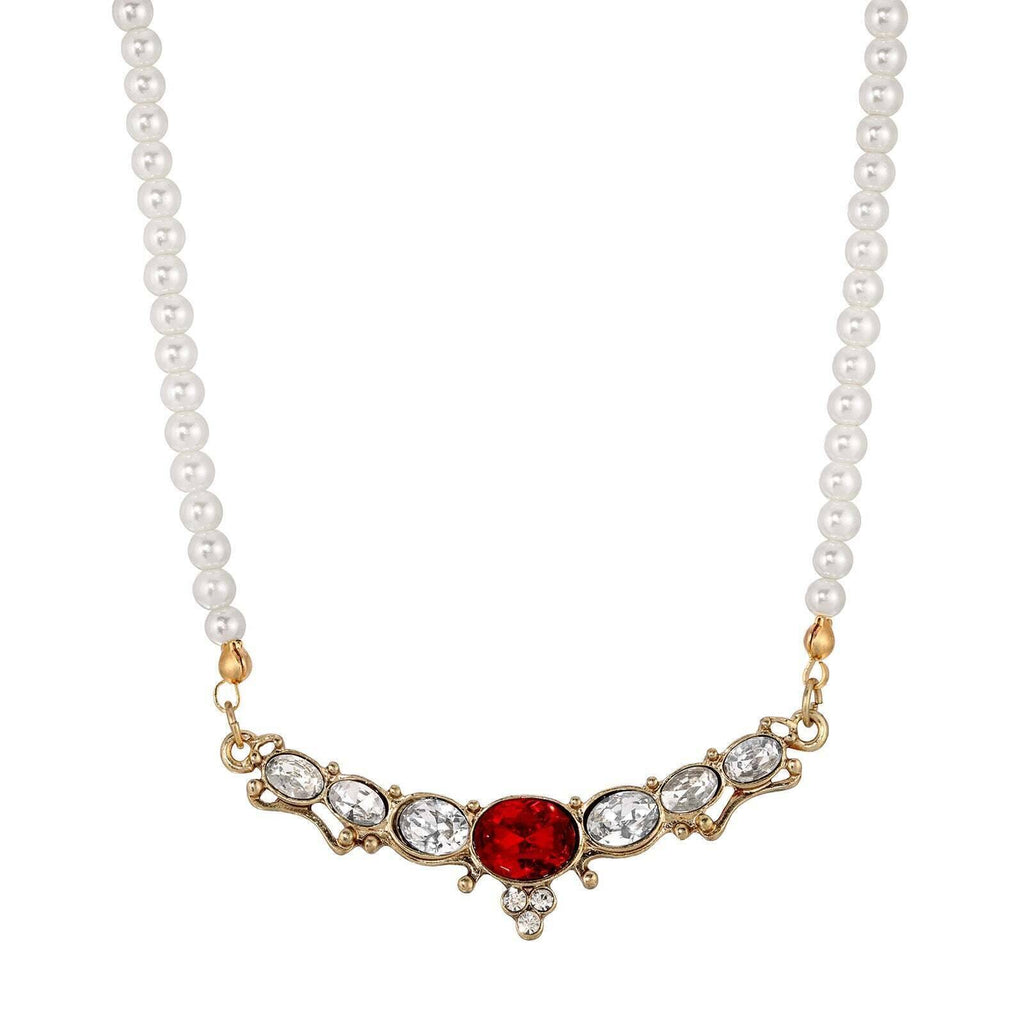 Elegance at its finest. This sophisticated necklace features a strand of faux pearls with vintage style framework and accented with clear crystals and an oval red crystal at the center. This necklaces comes with a 3-inch extension chain with lobster clasp.