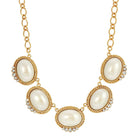 A fabulous drop necklace perfect for spring and summer time! Featuring five oval shaped faux pearl stones accented with sparkling European crystals, The linking chain comes with a 1928 logo tag, lobster clasp and 3 inch extension chain.