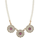 Revamp your casual wardrobe with this stunning floral faux pearl necklace. Beautiful flower blossoms, intricately designed from round filigree, adorned with sparkling amethyst purple crystals, lend a touch of sophistication to any outfit.