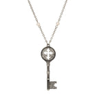 The vintage inspired antiqued key pendant features a cross, which is a type of trefoil called the Budded, Apostle's or Disciples Cross; also sometimes referred to as the Cathedral Cross. The 28" cable chain necklace comes accented with white round faux pearls.