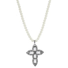 A brilliant and classic inspirational faux pearl strand necklace made perfect for most any outfit! Featuring a filigree pewter cross with petite round clear crystal accent and four octagon crystal clear stones. The pendant dangles from a 10mm faux pearl strand with a 3 inch extender.