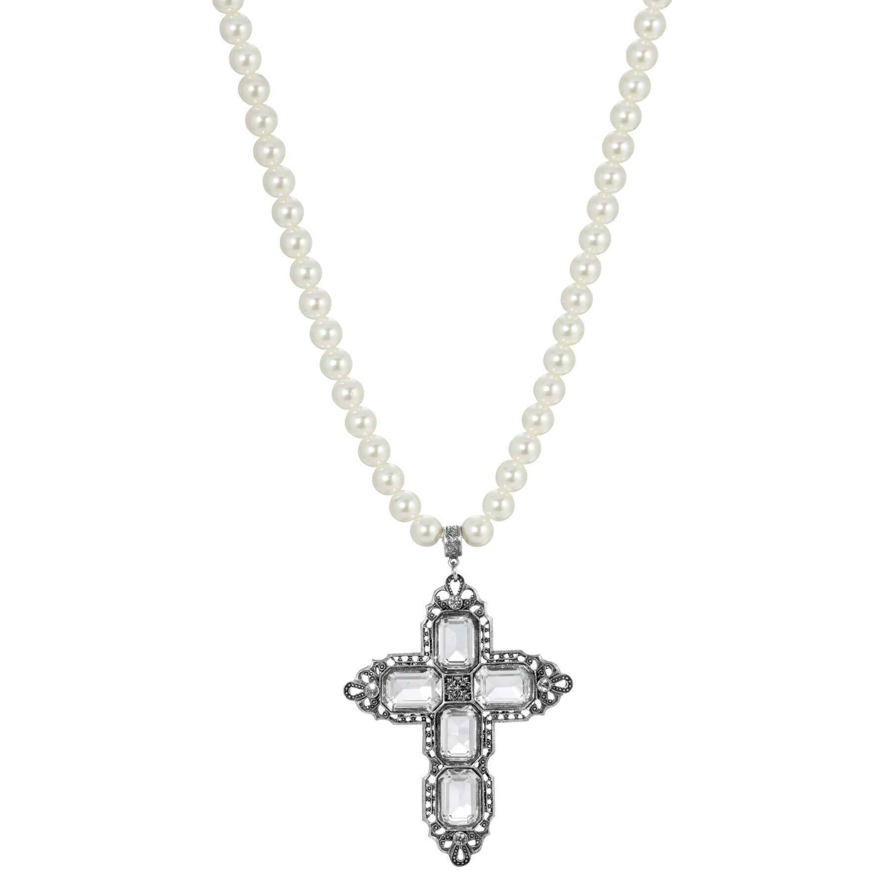 Symbols Of Faith Octagon Stone Cross Pendant 10mm Faux Pearl Strand Necklace 18" + 3" Extender