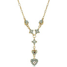 A delicate "Y" shaped necklace set in matte gold tone. The necklace is accented with heart and flower shaped accents which are adorned with turquoise colored beads and clear crystals. A small red Swarovski Crystal Elements dots the center of one of the hearts for an added color and shine.