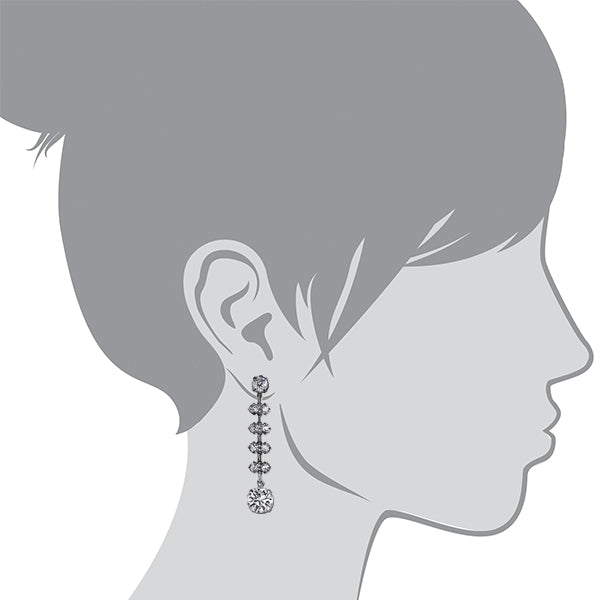 Sparkling clear crystals gleam against a jet black metal setting and lavishly trail down to over-sized pear-shaped drops. A gorgeous set of linear earrings with a dramatic flair.