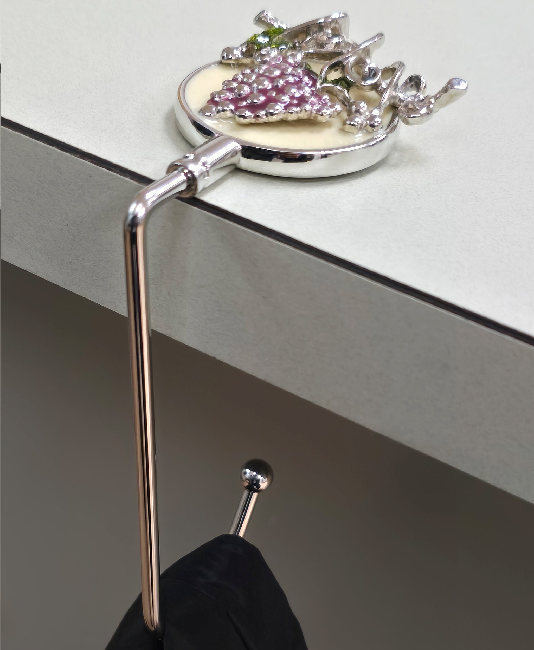 This elegant purse holder features a polished silver-tone base adorned with a detailed grapevine design, complete with sculpted leaves and a cluster of deep purple grapes. The sturdy hook rests securely on a table edge, keeping your handbag clean, visible, and within easy reach. Both functional and decorative, it adds a touch of refined charm to everyday outings, dining, or travel.