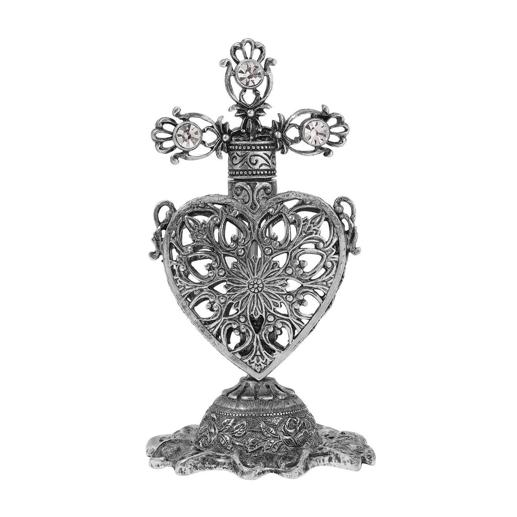 A uniquely designed vintage inspired perfume bottle and stand featuring a floral pewter base & filigree heart & cross perfume bottle with clear crystal accents. The functional perfume bottle comes with a 6mm funnel.