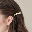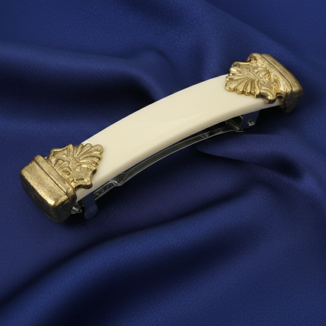 Gracefully composed, this hair barrette pairs a serene rectangular ivory white frame with scallop-shaped ends dipped in radiant 14k gold. The sculpted contours and balanced proportions evoke classic refinement, capturing a sense of quiet luxury rooted in vintage-inspired design. An elegant finishing touch, it reflects the enduring beauty of thoughtfully crafted adornment.