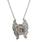 This vintage-inspired butterfly pendant exudes intricate charm, boasting ornate details reminiscent of a bygone era. Complete with a double photo locket, it offers a sentimental touch to any ensemble. Suspended elegantly from a cable chain secured with a lobster clasp closure, it adds a whimsical yet meaningful accent to your jewelry collection.