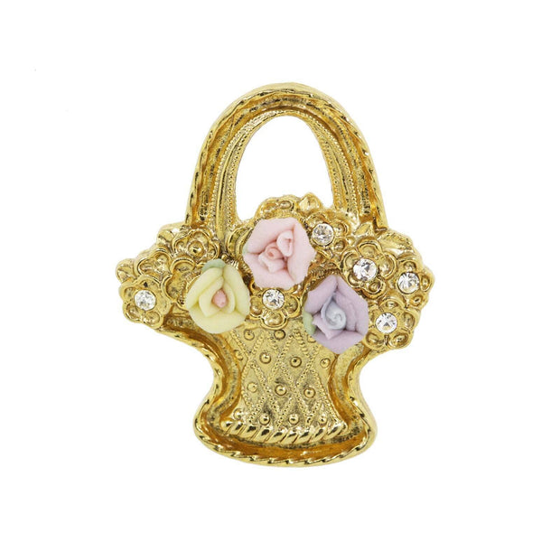 1928 Jewelry Pink, Purple, And Ivory Genuine Porcelain Rose Flower Basket Pin