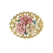 1928 Jewelry Pink And Ivory Genuine Porcelain Rose Cluster Filigree Pin