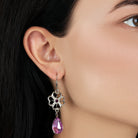 These dangling earrings showcase a delicate four-leaf clover design accented by a sparkling amethyst crystal at the center. A pear-shaped amethyst crystal hangs gracefully below, bringing vibrant color and gentle movement. The silver-tone metal offers a sleek contrast, highlighting the charm and whimsy of the clover motif.