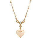 A romantic puffed heart pendant glows softly in a warm 14k gold dipped finish, suspended gracefully from a vintage-inspired chain. Above the heart, a sparkling crystal accent adds a delicate touch of brilliance and charm. This necklace brings a nostalgic elegance with its ornate details and classic silhouette.