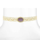 Our sweet ivory lace choker necklace will put the finishing touch on any outfit. This dainty cream color lace choker subtly boasts a "chain of hearts" ? embroidered all round and features a lovely color moonstone filigree center piece. This vintage-style off-white color choker is Ideal for a bride-to-be and is sure to become a favorite heirloom.